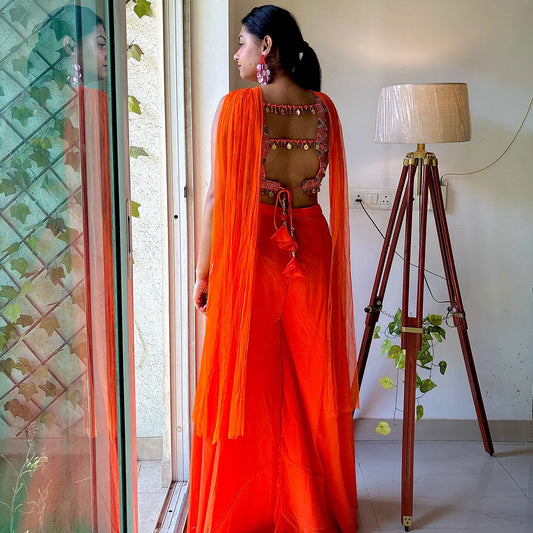 Wore a bright orange Indo-Western set for a sangeet function — the design was so unique and I got tons of DMs asking where it's from. Highly recommend House of Khushraa!